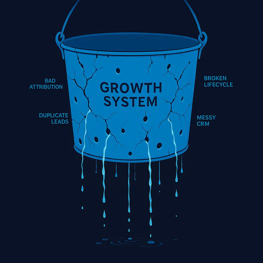 Your growth isn’t slow because of bad ads. It’s slow because you’re running on spreadsheet duct tape and prayer. The Bucket With 47 Holes Here’s what “growth infrastructure” looks like at most companies: Lifecycle stages that mean nothing Lead statuses that contradict each other Attribution held together by Excel formulas A CRM full of duplicates […]
